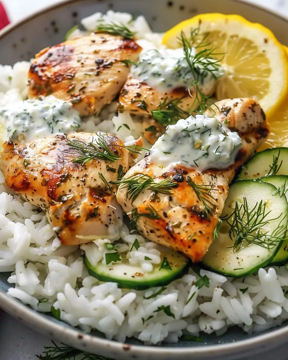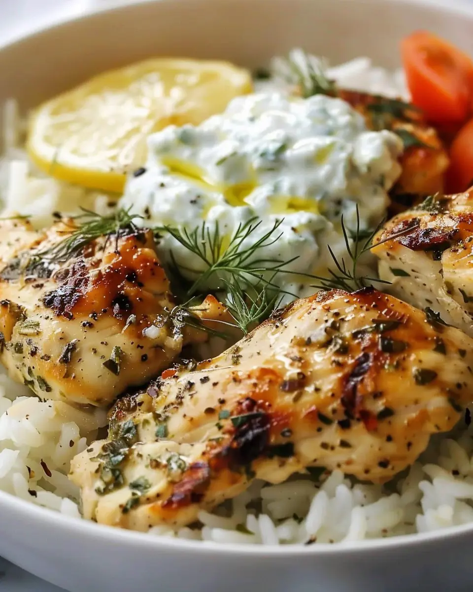 - Layering: Serve the rice and chicken in a shallow bowl, add a generous dollop of tzatziki on top, and sprinkle fresh herbs for a burst of color.